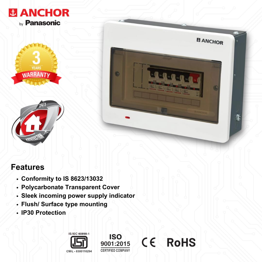 Anchor by Panasonic is a well-known brand recognized for quality and safety. The UNO Plus 6 Way Distribution Board complies with IEC (International Electrotechnical Commission) standards, ensuring that it meets global safety and quality benchmarks. This guarantees a high level of electrical safety and reliability for your home.