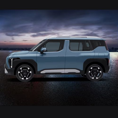 The Syros adopts a boxy design inspired by Kia's EV9, featuring a bold front grille, vertical headlamps, and L-shaped LED taillights. The muscular stance, sharp creases, and flared wheel arches enhance its SUV appeal.